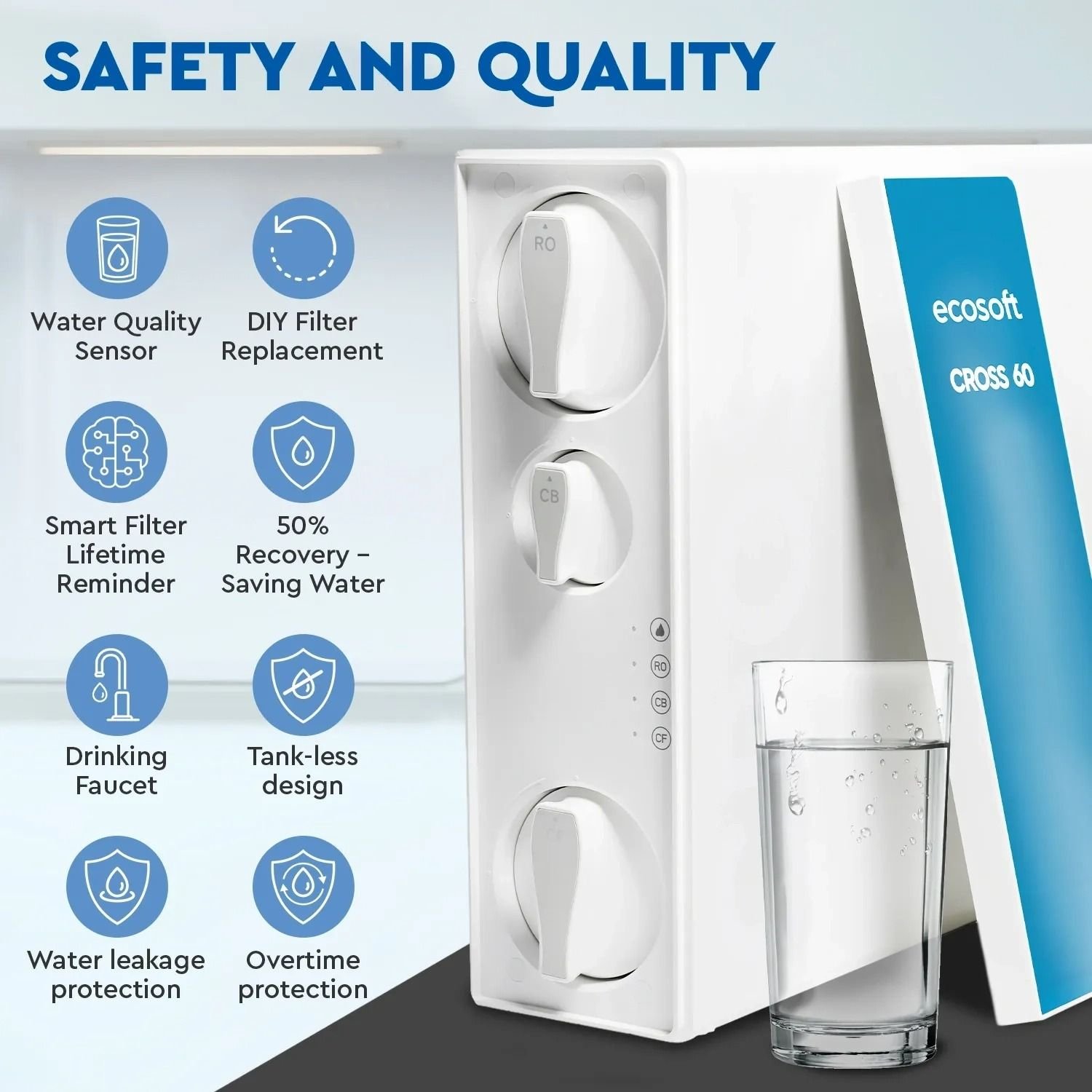 Ecosoft Cross 60 – tai moderni tiesioginio srauto atvirkštinio osmoso sistema, skirta namams ir biurams, kuri užtikrina aukščiausios kokybės geriamąjį vandenį be atskiro kaupimo bako. Sistema filtruoja vandenį realiu laiku, todėl visuomet gaunate šviežią, švarų ir malonaus skonio vandenį.