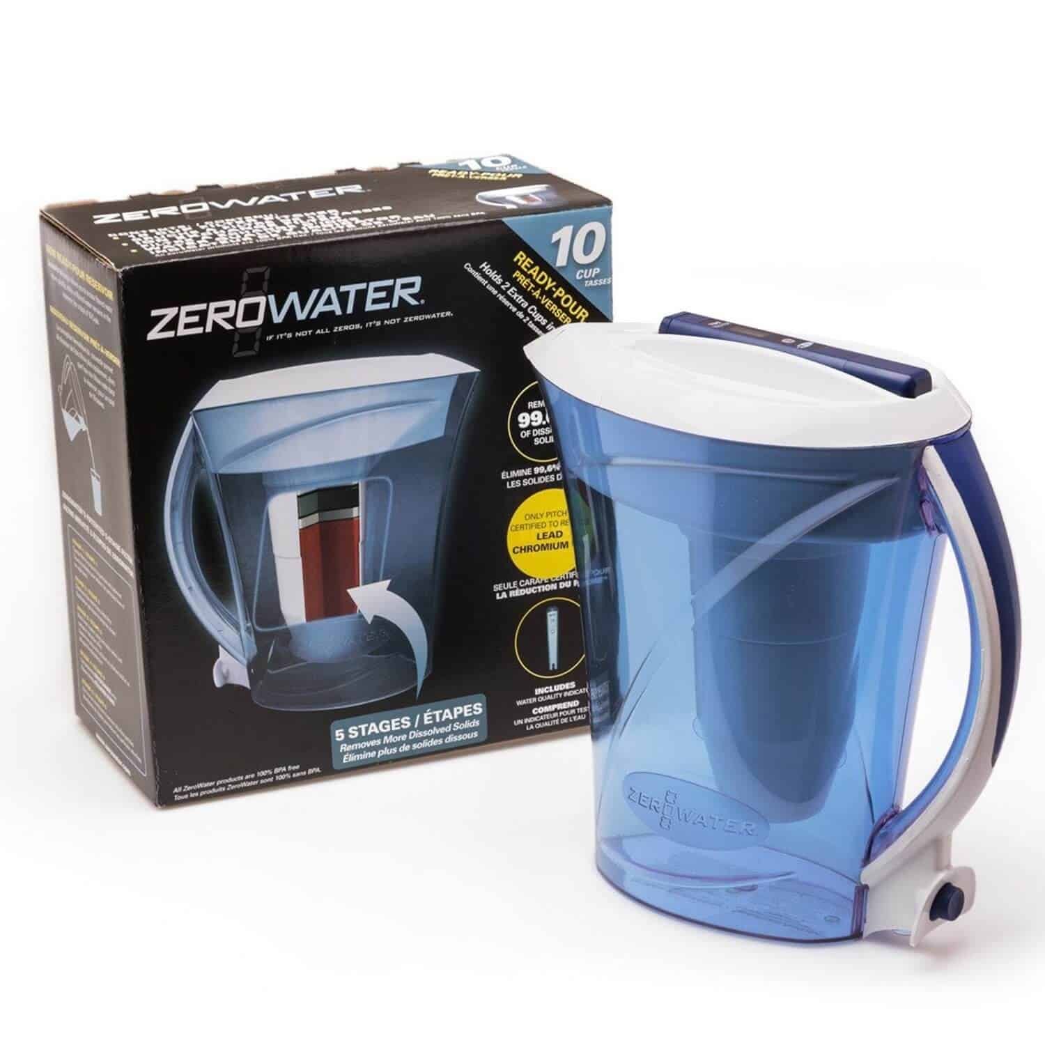 10 stiklinių Ready-Pour™ naudoja ZeroWater filtravimo sistemą, kuri apjungia penkias sudėtingas technologijas, kurių bendras darbas užtikrina, kad iš čiaupo vandens bus pašalintos beveik visos ištirpusios kietosios medžiagos. Rezultatas – puikus vanens iš čiaupo skonis. Tai yra vieninteliai rinkoje įpilami filtrai-ąsočiai sertifikuoti NSF, kurie sumažina švino koncentraciją.